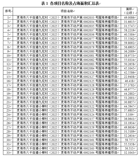 錦州信洋水產(chǎn)養(yǎng)殖有限公司委托,遼寧研海生態(tài)科技有限公司編制完成了錦州鹽場周邊海域33個圍海養(yǎng)殖項目環(huán)境影響報告書及公眾參與說明,項目列表見表1。根據(jù)《環(huán)境影響評價公眾參與辦法》(生態(tài)環(huán)境部令 4號)要求,現(xiàn)對環(huán)評報告書全本及公眾參與說明進(jìn)行報批前公開。